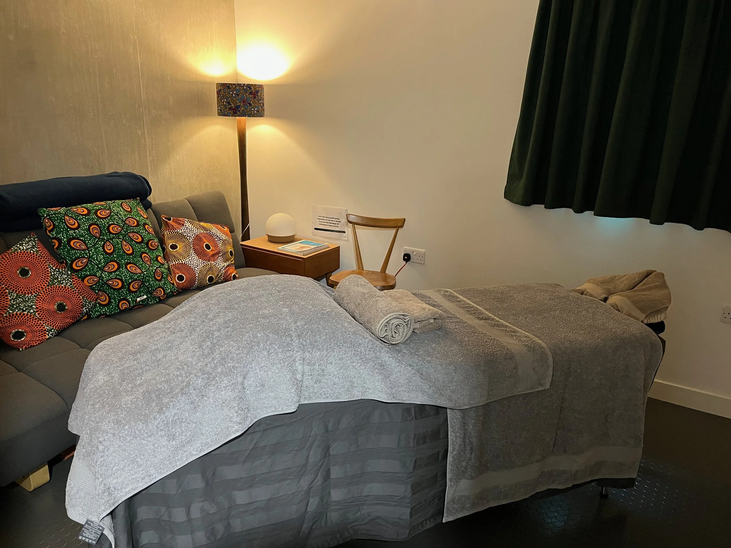 In the massage room there is a sofa for consultations and a massage couch for treatments.